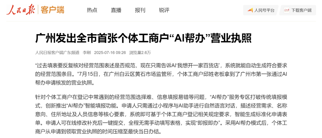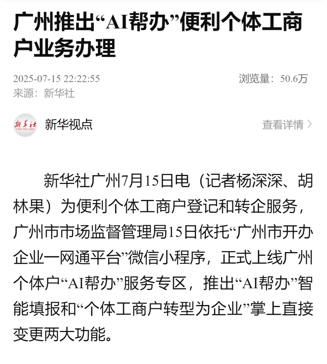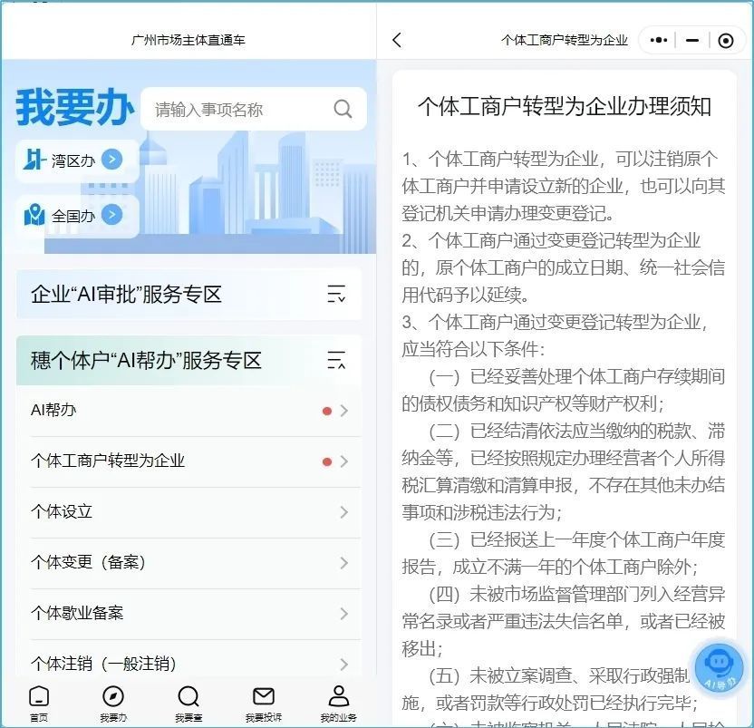 为便利个体工商户登记和转企就业,广州市市集监督处分局7月15日依托“广州市开办企业一网通平台”微信小智商,认真上线广州个体户“AI帮办”就业专区,推出“AI帮办”智能填报和“个体工商户转型为企业”掌上径直变更两大功能。